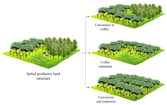 From this initial structure, it is possible to observe three main changes in the organic coffee agroecosystem: (1) conversion to coffee, which occurs when the agricultural activities are converted into coffee production; (2) coffee expansion, which occurs when coffee plantations expand into forested areas; and (3) expansion-conversion, where coffee production areas substitute both forested and agricultural areas.