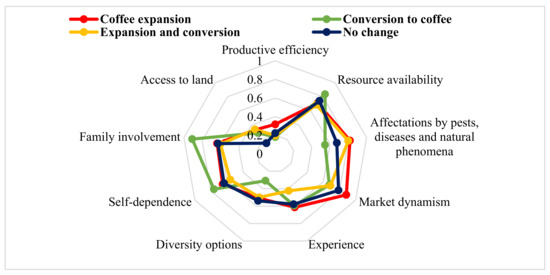 Concerning the four processes of change, the highest average sustainability index was presented by coffee expansion producers, being about 56% (Figure 6).