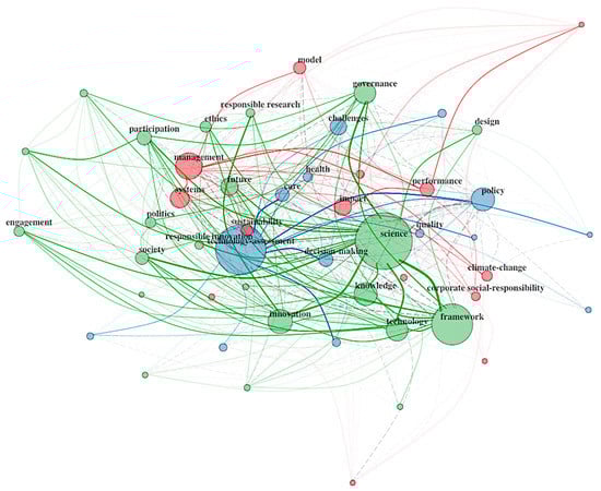 The next level of analysis is that of the co-occurrence network (as shown as Figure 1), a crucial knowledge mapping device used to reveal the relationship between different knowledge units []. In our case, we analyzed the keyword co-occurrences network in the merged dataset of TA, RRI and SR publications. The TA subnetwork, marked with blue color, shows that the main theme of “technology assessment” is connected with the themes of “policy”, “decision making” and “challenges”. The RRI subnetwork, marked with green color, shows that the main theme of “science” is connected with the themes of “framework”, “knowledge”, “society”, “participation” and “governance”. The SR subnetwork, marked with red color, shows that the main theme of “management” is connected with the themes of “system”, “performance”, “climate-change” and “impact”. Fifty-one records were derived directly from journals in the domain of “Management”, for instance, Academy of Management Annals, Supply Chain Management—an international journal, Research Policy and Journal of Operations Management were all represented in the sample. This denotes that SR is related to supply chain management, marketing research and user engagement, which are all important research topics in the domain of management science [,,,,]. Further analysis of the subnetworks could provide a detailed view of the thematic development in each discipline. For instance, it would be interesting to research further the thematic priority of “management” in SR and its relationship to similar themes in TA and RRI, although one could guess that this refers to managing natural systems (and hence, its relationship to Systems Analysis in the TA tradition). However, for the purposes of our current focus, we can observe the importance of science governance and science policymaking in the three fields directly connected to discussions on impact assessment.