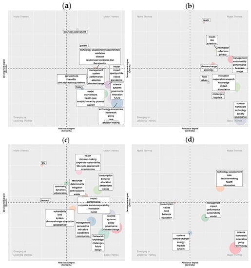 The final analysis level using bibliometrics is that of thematic map, considered a convincing method to reveal keywords as scientific research development indicators []. The thematic map is based on the categories of basic, motor, niche and emerging or declining themes. It shows correlated thematic focuses and their movement (or lack of) through time. (Themes in the upper-left quadrant (Niche Themes) have well developed internal ties but unimportant external ties and are therefore of marginal importance to the development of the field. Themes in the upper-right quadrant (Motor Themes) are both well developed and important for the structuring of the research field. Themes in the lower-right quadrant (Basic Themes) are not well developed but are important for the field. Themes in the lower-left quadrant (Emerging or Declining Themes) present both weak development and are marginal for the selected field.) In our case, we are particularly interested in “basic themes” that represent a constant focus and “motor themes” that represent a developing focus.
