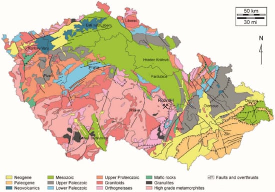 - Kříbek, B.; Žák, K.; Dobeš, P.; Leichmann, J.; Pudilová, M.; René, M.; Scharm, B.; Scharmová, M.; Hájek, A.; Holeczy, D.; et al. The Rozna Uranium Deposit (Bohemian Massif, Czech Republic): Shear Zone-Hosted, Late Variscan and post-Variscan Hydrothermal Mineralization. Miner. Depos. 2008, 44, 99–128. [Google Scholar] [CrossRef]