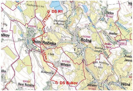 The decontaminated water will be taken into the built retention tank located at the boiler plant in Dolní Rožínka through the built pipelines from the R1 and Bukov decontamination stations (DS) for a total length of about 4.5 km, see Figure 2. The proposed supply pipeline will consist of two branches: a northern branch from DS R1 of approximately 1.5 km and a southern branch from DS Bukov of approximately 3.0 km.