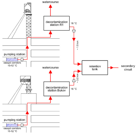 Mine water is pumped from the mine site to decontamination stations, where it is subjected to a decontamination process to remove insoluble substances, heavy metal elements and radioactive elements. At the output of the treatment process, the decontaminated water can be considered environmentally safe and, therefore, suitable for further use. During this process, the mine water is also heated from 10–12 °C to 16 °C, which represents a considerable financial saving.
