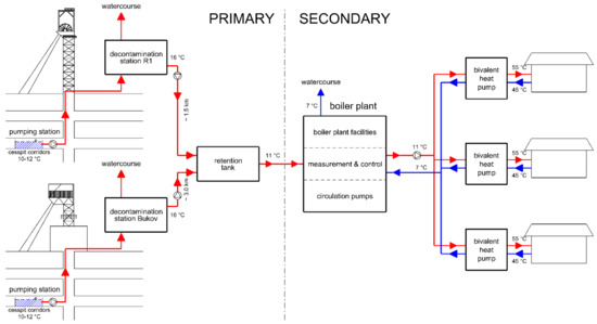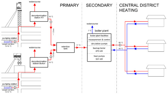 The Rožná I Mine pumps mine water through the R1 shaft and B1 shaft. As already mentioned, a part of the deposit is currently flooded. Therefore, the assumed maximum flow rate of 48 L.s−1 of pumped water can only be expected after 2024, when mine water reaches the level of the 12th level and when pumping is resumed in full [26]. The use of this volume is conditional on the construction of two supply pipelines to the two decontamination stations R1 and Bukov. The decontamination stations are pumped with mine water at a temperature of 10–12 °C, with treated water at 16 °C at their outlets. It is therefore appropriate to locate the equipment for the abstraction of these waters for the CDH purposes of the municipality of Dolní Rožínka. As this is decontaminated mine water, it is possible to consider its controlled discharge into the watercourse after previous use.