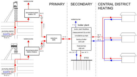In Option 2, as in the previous option, the mine water is accumulated in a retention tank and then transported via the secondary open circuit to the boiler plant heat pumps, where it transmits its heat and is further discharged into the watercourse. The heat produced by the heat pumps is then distributed through the CDH circuit to individual buildings (mainly in the winter season), but it is also stored in an underground heat storage facility—borehole thermal energy storage mainly in the summer season, where it is then used to boost the heat supply in the winter. As in the previous option, a backup heat source in the form of a gas boiler is located in the boiler plant.