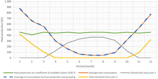 Figure 8 shows that, in month 4, customer consumption falls below the production level. Therefore, any extra heat produced starts to be stored in the BTES underground heat storage. Here, it will be stored periodically in the period from month 4 to month 9. From the 10th to the 3rd month, the underground heat storage will be used to supplement the heat supply that standard production would otherwise not meet. Figure 8, therefore, shows the maximum overlap of the average heat consumption curve with the heat production and pumping curve and the minimum production losses.