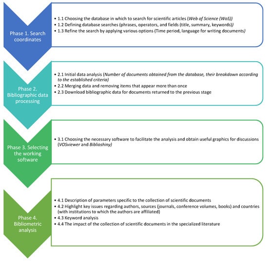 Regarding the methodology underlying the development of this research, it is clearly presented, step by step in Figure 2. The working methodology is a vision of the authors, built on a structure found in Janik, Ryszko and Szafraniec [68] and based on the so-called concept of “science mapping” developed by Aria and Cuccurullo [69].