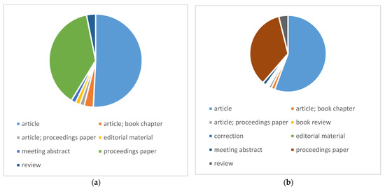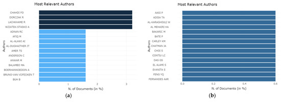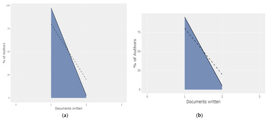 The dotted line in Figure 9 represents the theoretical distribution of scientific productivity in Lotka’s Law, and the blue area represents the distribution associated with the documents in our collection. Aria & Cuccurullo [69] explain Lotka’s law by referring to the fact that as the number of published articles increases, the number of authors who reach that number decreases. Thus, for situation (a), we have over 90% of the authors with unique contributions to the collection of documents to be analyzed. For situation (b) we have over 80% for authors who contributed with only one scientific paper. It can be seen that the two values are higher than the theoretical distribution of Lotka’s law, which includes them in the category of authors with “occasional” contributions. On the right side of each graph, one can see the percentage of authors who contributed with 2 documents, about 5% in both situations.