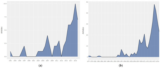 According to Figure 4, both topics (a) and (b) have ups and downs over the studied periods, which means that the increased interest of researchers is manifested in certain years, or breaks of several years (most the long break is 10 years for topic (b) of the impact of OC), prior to some research, in which the interest was clearly reduced. However, according to the graphs, since 2013, both topics have gained momentum in research, the scientific documents thus published, maintaining an upward trend until 2019.