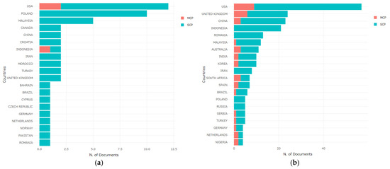 An aspect of high importance is shown in Figure 5. This indicates the largest contributor, as a provider of scientific papers on OC and its influencing factors, and its impact, namely the United States of America. Romania is also in both rankings, even among the top five for ranking (b). The two graphs also show two measurements: (1) MCP—multiple country publications (refers to those documents that have at least one co-author from another country); (2) SCP—single country publications (refers to documents whose co-authors are from the same country). One can easily see the high proportion of SCP compared to the MCP in both situations, which in fact indicates a low or even very low degree of international cooperation for countries where only SCP values have been reported.