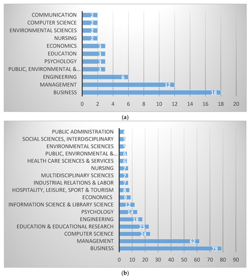Regarding the classification of documents by areas (WoS categories), it can be seen from Figure 6 that most of them are included in the categories “Business” and “Management”, which we expect, if we consider the specifics of the topic covered in this analysis.