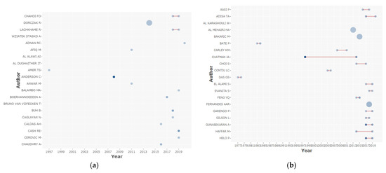 Figure 7 shows the top 15 authors with the most contributions (as a percentage) to the documents’ collection. Among them is the author Conțiu [70,71] with two scientific papers presented at international conferences, papers on the influence of OC on competitiveness in higher education institutions, and also on knowledge management. Regarding these authors, the following figure (Figure 8) shows how their contributions were distributed over time (by drawing a specific number of circles). The size of each circle represents the number of publications in a year, so larger the size of a circle, than more scientific publications in a year.