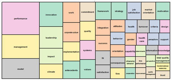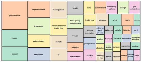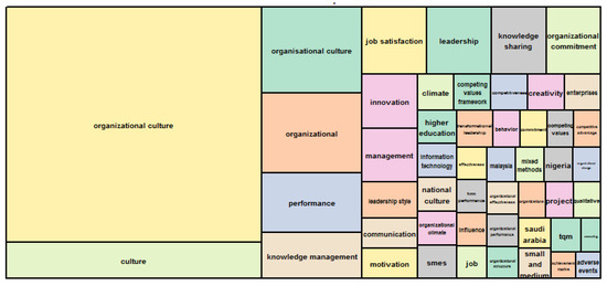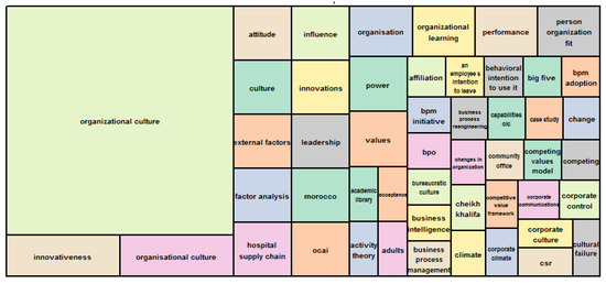 For documents on OC determinants, keyword analysis begins with tree charts, both for the keywords provided by the authors (Figure 12) and for the PLUS keywords (Figure 13). The size of each spot in the tree is given by the frequency with which the keywords appear. It can be noticed that in the specialized literature the word combination “organizational culture” predominates and that only in a certain proportion “organisational culture” for OC also appears. The term “organizational” is replaced in some works with “corporate”, hence the word combination (with a low frequency of occurrence through keywords) “corporate culture”. Among the words in the first tree defining elements of OC can be found, such as “values” and “attitudes”, while the words “innovation” and “performance” appear in both structures (although with different frequencies, they refer to the implications of OC in the organizational environment).