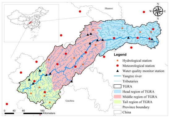 The catchment area of the TGRA covers 64,000 km2 and stretches at a river length of about 660 km long starting from the TGD. The terrain of the TGRA is characterized by gently undulating hills and plains (Figure 1). The watershed lies between 28°10′ and 32°13′ N latitude and from 105°17′ to 110°11′ E longitude with an altitude variation from 73 m to 3105 m. The dominant soil types of the TGRA are purple, limestone and yellow earths. The TGRA is predominantly under a cropland and forestland landscape. The TGRA experiences a subtropical monsoon climate in which the mean annual temperature is around 18 °C. The average annual precipitation is approximately 1400 mm, with about 80% occurring from April to October. Annual water surface evaporation in this region ranges from 900 mm to 1530 mm.