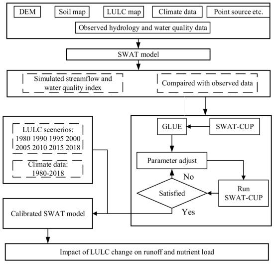 The SWAT model in the TGRA was calibrated and validated by the SWAT-CUP with the GLUE method. The details of sensitive analysis and model calibration and validation were acquired in our previous study [53,58] and the results showed a promising model performance for further analysis. The calibrated SWAT model was used to run the simulation under different land use conditions from 1980 to 2018. The detailed methodology of the calibration is described in Figure 2.