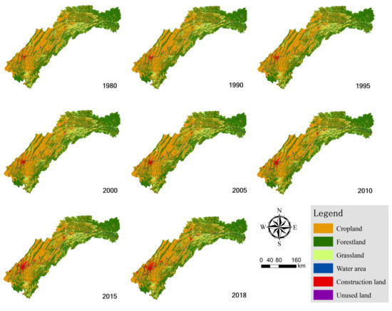 The LULC distribution of the TGRA exhibited a distinct spatial heterogeneity during the past 40 years from 1980 to 2018 (Figure 3). Cropland and forestland were the most widely distributed types of landscape in the TGRA. Cropland was concentrated in the west and north of the TGRA, whereas forestland was mainly distributed in the east and southwest. The distribution of grassland was relatively scattered, mostly in the southwest and north-central regions of the TGRA. Construction land was mainly distributed along the rivers in large central urban areas. The Chongqing downtown, located west of the TGRA, had the largest urban area, which expended dramatically during previous years. The water area was mainly distributed along the main stream and tributaries of the Yangtze River. The proportion of unused land in the TGRA was very small, which could have been neglected in the analysis.