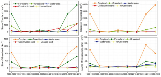 The LULC change in the TGRA displayed distinct transformation phases (Figure 4). These transformations among cropland, forestland, grassland, construction land and water area mainly occurred during 1980–1990 and 2015–2018.