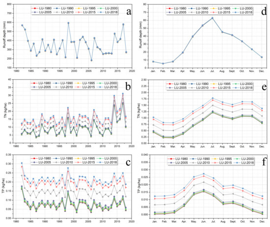 Impact of land use/cover change on runoff and nutrient load in the TGRA. (a) annual runoff depth; (b) annual TN load; (c) annual TP load; (d) monthly average runoff depth; (e) monthly average TN load; (f) monthly average TP load.