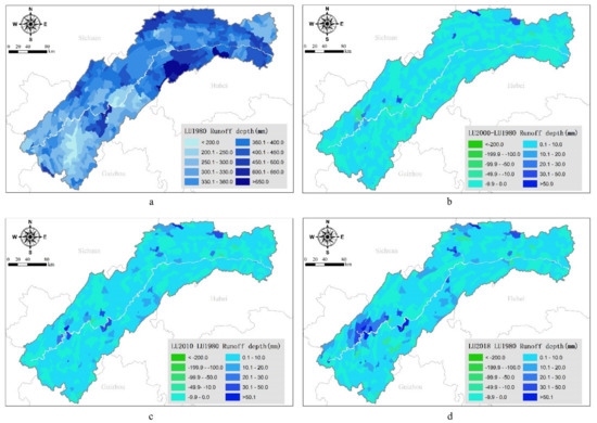 Spatial differences of runoff depth under LULC change in the TGRA. (a) runoff depth under land use of 1980; (b) changes of runoff depth between 1980 and 2000; (c) changes of runoff depth between 1980 and 2010; (d) changes of runoff depth between 1980 and 2018).