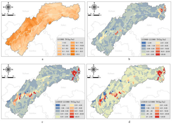 Spatial distribution differences of total nitrogen load of the TGRA under LULC change. (a) TN load under land use of 1980; (b) changes of TN load between 1980 and 2000; (c) changes of TN load between 1980 and 2010; (d) changes of TN load between 1980 and 2018).