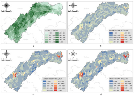 Spatial distribution differences of total phosphorus load under LULC change in the TGRA. (a) TP load under land use of 1980; (b) changes of TP load between 1980 and 2000; (c) changes of TP load between 1980 and 2010; (d) changes of TP load between 1980 and 2018.