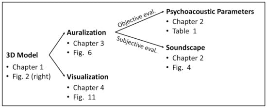 Since these values are derived—from a technical point of view—from data in frequency domain, the loss of temporal information makes it impossible to analyze the sensation of how they sound for listeners in the urban environment. For this, two branches can be distinguished: Psychoacoustic parameters and the soundscape approach (Section 2). To see how this discrimination is reflected in the structure of the paper, refer to Figure 1. For deeper understanding of human auditory perception of urban environmental noise, simulations must include spectro-temporal and spatial features that, in turn, enable the listener to experience the sound field as a whole and interact with sounding objects []. Finally, since it is known that hearing sensation is influenced by multimodal effects such as audiovisual coupling as impressively described by, e.g., the McGurk effect [], the visual representation of a scene is indispensable for perceptual studies.