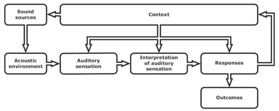 Two elements of the soundscape concept (Figure 4)—sound sources and acoustic environment—are common to the auralization paradigm. On the perceptual side, it supplements the model with the listener’s context. Per definition, the context includes the interrelationships between person, activity and place, in space and time. The context may influence soundscape through the auditory sensation, the interpretation of auditory sensation, and the responses to the acoustic environment.