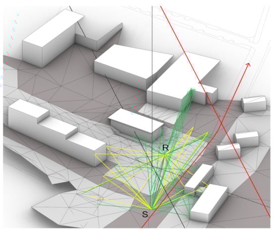 At the example of the IHTApark model (Figure 6), a virtual car is placed at the source position S and the receiver is sitting on the bench at position R. The visualization in Figure 6 separately indicates the reflected and diffracted sound paths between S and R. While the reflections occur at the building façades and the ground, the diffractions occur at the building edges.
