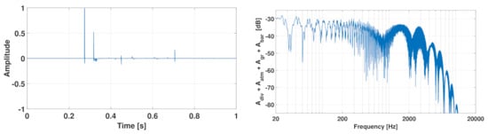 Impulse response (left, normalized) and according transfer function (right) between the positions of source S and receiver R from the scenario in Figure 6.