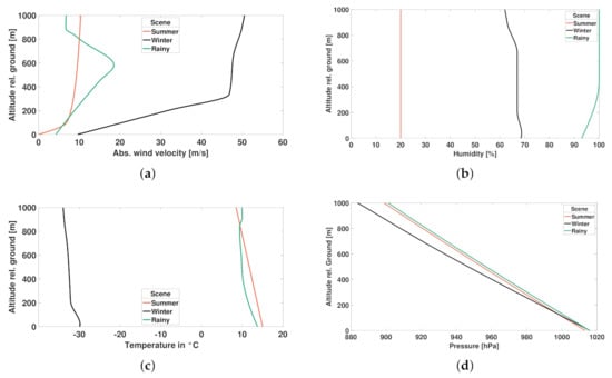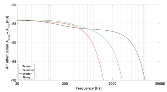 The influence of different weather conditions on the noise levels and the psychoacoustic perception of aircraft noise was studied by the authors in []. As exemplary scenarios of this paper’s case study, three different weather conditions are shown—summer, winter and rainy—to illustrate the influence of the physical medium parameters that are contained in Figure 8 and Figure 9.