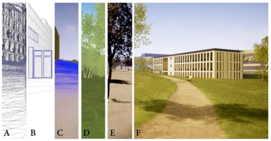 Visualization workflow: (A) Photogrammetry; (B) Modelling and mapping; (C) Landscape modelling; (D) Materials; (E) Lighting; (F) Postprocessing.
