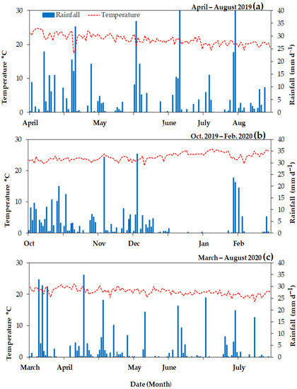 A completely randomized block design field experiment was conducted at Bulindi Zonal Agriculture Research Development Institute, Western Uganda (1°00′–2°00′ N and 30°30′–31°45′ E, 1276 m asl) [26]. The climate of Bulindi is tropical, wet and dry with highly spatial and temporal rainfall distribution [27]. The study was conducted for three growing seasons and it was completely rainfed, whereby the first season begun in March 2019 and ended in August 2019 and was characterised by relatively long rains (Figure 1a). The second season ran from October 2019 to February 2020 (Figure 1b), while the third season started in March 2020 and ended in August 2020 (Figure 1c).