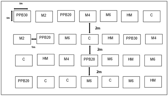 Experimental layout in field experiments with four treatments C = Control, HM = Halfmoon, PPB 20cm = Permanent Planting basin circular pits of 15 cm diameter and depth of 20 cm; PPB 30cm = Permanent Planting basin circular pits of 15 cm diameter and 30 cm depth; M 2 cm, M 4 cm and M 6 cm = soil surface covered with 2 cm, 4 cm, and 6 cm thick layer of dry grass materials, respectively.