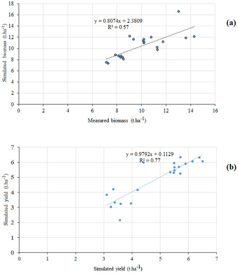 The accuracy of the model was also further assessed using correlation analysis (Figure 3a,b). The overall correlation between the measured and simulated biomass at maturity was medium (0.57) (Figure 3a), while there was a strong positive correlation (0.77) between the measured and simulated values of grain yield (Figure 3b).