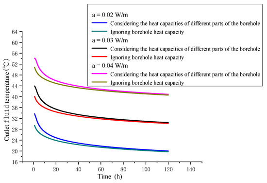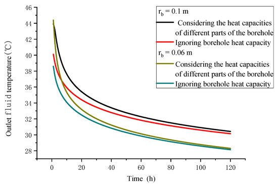 - When the borehole radius was larger, the borehole heat capacity had a greater impact on the performance of DCBHE. Under the working condition studied in this paper, ignoring the borehole heat capacity led to a 0.28 °C lower estimated outlet fluid temperature after 120 h for rb = 0.1 m, and to a 0.16 °C lower estimated outlet fluid temperature after 120 h for rb = 0.06 m.