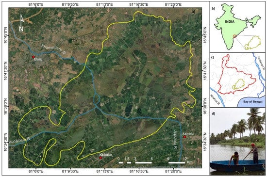 (a) Kolleru Lake aquaculture; (b) location of the study area in India map; (c) Kolleru Lake catchment; (d) practicing of aquaculture (photo: Monika Mandal).