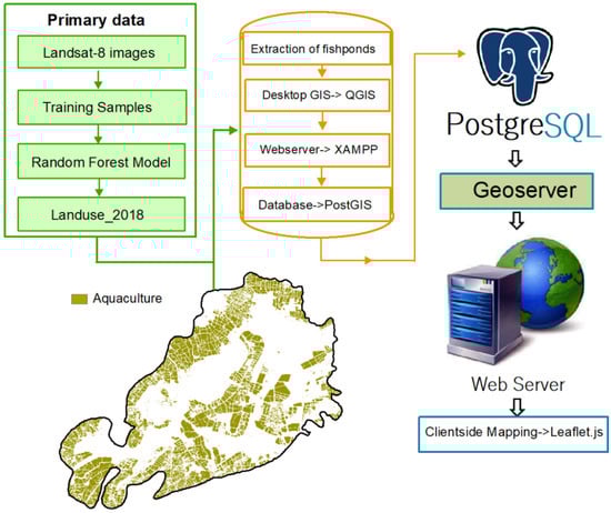 The web model application has a three-layer architecture. PostgreSQL was extended with PostGIS, used as a backend to store the fishpond data. The GeoServer was used to create layer services and to allow the publication of the PostGIS data in a web server, while the Leaflet library was used to create the Graphical User Interface (GUI). The Leaflet, created by Vladimir Agafonkin, is the leading open-source JavaScript library for web-based interactive maps, and it is updated continuously []. It has been well documented and supported for different applications with large amounts of plugins. For this study, the Leaflet library for a working environment for programming was used. We used it for a web browser user interface to develop a map request entry webpage. For example, if a user has entered the construction of a new illegal fishpond location, the webpage receives a request from the user by selecting a “request map” button. After that, new fishpond data are typically generated in the remote server from the user’s device to synchronize the new data into an existing database.