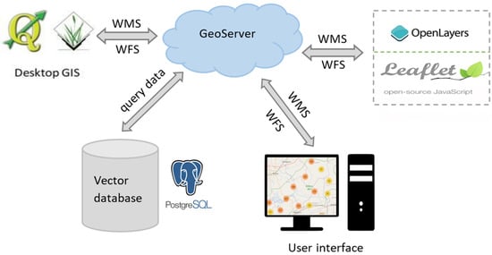 The client–server module interface affords the individual users to configure and manipulate the fishpond mapping data remotely. The data layer provides access to the database through web services. The web service is a gateway between the data layers to allow the client application and server application to access the database. Furthermore, the published fishpond data layer in GeoServer is accessed through the leaflet. The overall client–server architecture of a generated web mapping application is shown in Figure 3.