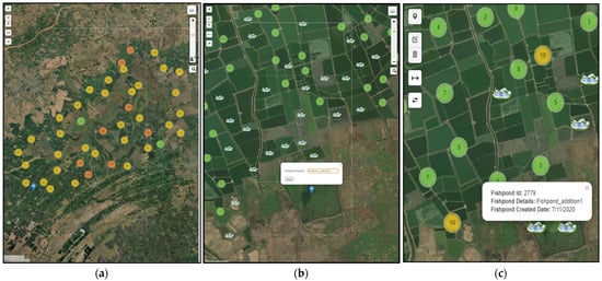 Figure 4c illustrates the user’s desired location of a fishpond saved in a database identified on a webpage with a marker icon (i.e., fishpond ID, latitude and longitude, and date). The newly entered fishpond displayed on a web page shows a new ID, name, and created date. This helps to assess uncertainties related to older and potentially out-of-date information.