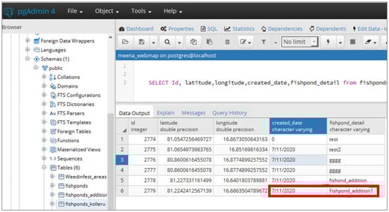 Figure 5 shows that new fishpond credentials with the name “Fishponds_addition1” were saved in a PostGIS database and reflected on a map with current time and detail. This application allows any new fishpond entry to be displayed on a webpage and registered in the existing database.