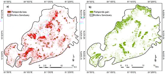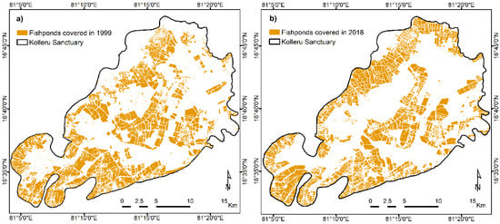 Figure 6 depicts the displacement of the fishponds’ occupation area before and after the Kolleru wildlife sanctuary restoration measures. The fishpond data for 1999 are derived from the Kolli et al. (2020) land use classification map for further analysis [].