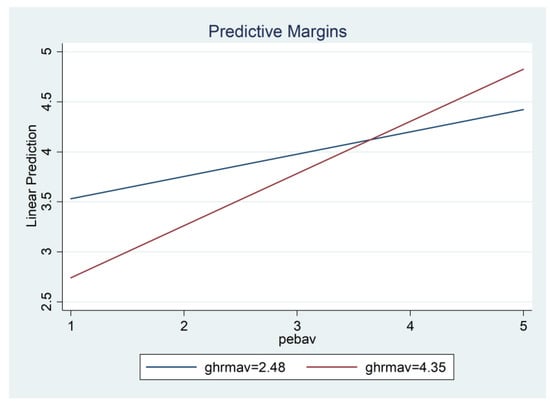 Hypothesis 4 predicted that GHRM would moderate the connection between ETL and PEB, so that the relationship is stronger when GHRM is high than when it is low. In the regression table, the interaction variable between environmental transformational leadership and GHRM was significant. The interaction coefficient was positive (β = 0.08, p < 0.05; Model 5), which confirms Hypothesis 4. The interaction effect is illustrated in Figure 2. A post hoc simple slope analysis was conducted, and it failed to reveal that the difference of the effects of ETL on PEB in high GHRM (simple slope = 0.26, SE = 0.08, p < 0.001) and low GHRM (simple slope = 0.11, SE = 0.06, p < 0.001) was significant. Thus, the moderation effect of GHRM between ETL and PEB was not fully verified. Thus, Hypothesis 4 is partly supported.