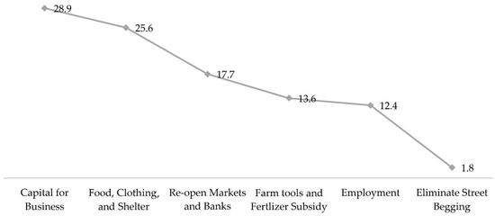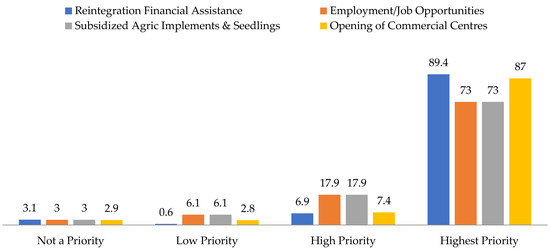 To reiterate the scaling of the economic needs, the rank of “not a priority” meant that displaced persons did not need such requirements for them to willingly return. For those ranked as “low priority,” it meant that although the displaced persons needed them, they were not too important to the community and they could live without for some time. While the rank of “high priority” meant the requirement was very important and such a need would affect their level of sustenance and survival. Finally, those ranked as the “highest priority” were those that the displaced would not even contemplate returning unless they were available. These four economic needs of reintegration of financial assistance is IOM benchmarked at a minimum of USD 580 for every returnee in an ideal situation [38]. The other three economic needs are EJO in the post-conflict communities, SAIS being an agrarian society, and OCC such as banks, shopping malls, local markets, and the like.