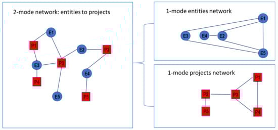 Example of the 1-mode networks (entities network and projects network) that are deducted from the 2-mode network (entities to projects network).