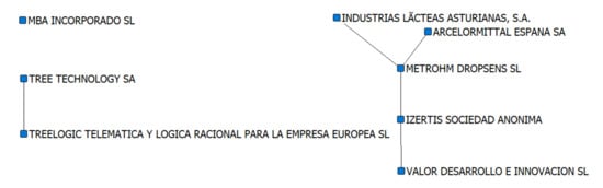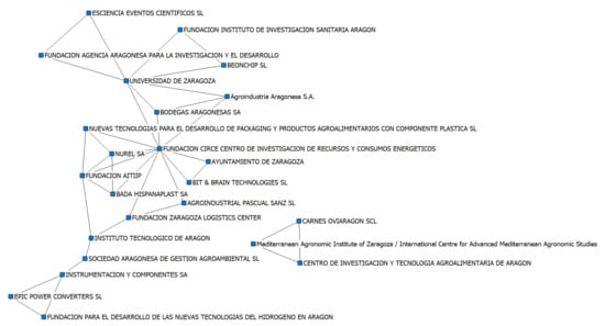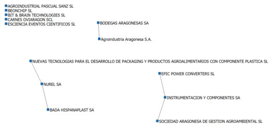 Regarding the individual entities, Table 12 presents those entities within the regional network of Aragón with the top ten values at three different indicators: degree, eigenvector and betweenness. A total of 19 entities are participating in these three top ten indexes. Two of them, the University of Zaragoza—the only public University in the region with a long tradition and a generalist scope—and Fundación CIRCE—a private nonprofit technology center focused on energy and sustainability—appear at the two first positions in the three indicators. The public research institute of the region (Instituto Tecnológico de Aragón, with a generalist scope) and the other private nonprofit technology center of the region (Fundación AITIIP, focused on plastics) appear at the third and fourth positions in degree and betweenness, respectively, not being present at the eigenvector top ten; thus having strong participation and serving as a link between other entities, but not having such a relevant position within the network. Then, there are five entities ranking in two of the three lists: one is a public research center focused on hydrogen technologies (Fundación para el Desarrollo de las Nuevas Tecnologías del Hidrógeno en Aragón), and the other four are private companies, two of them being spin-offs—one from Fundación AITIIP (TecnoPackaging) and the other from the University of Zaragoza (BEOnChip S.L.)—and the other two large companies. Finally, there are nine entities ranking in one of the indicators, two of them are public research institutes linked to the University of Zaragoza—one focused on health (Fundación Instituto de Investigación Sanitaria de Aragón) and one focused on logistics (Fundación Zaragoza Logistics Center)—,one is a public company from the regional government devoted to agriculture and environment (Sociedad Aragonesa de Gestion Agroambiental S.L.), one is the regional federation of businesses (Confederación de Empresarios de Aragón), three are spin-offs from the University of Zaragoza (Ebers Medical technology S.L. and Nanoscale Biomagnetics S.L. and Esciencia Eventos Científicos S.L.) and two are large companies—one devoted to household appliances (BSH Electrodomésticos España S.L.) and a winery (Bodegas Aragonesas S.A.).