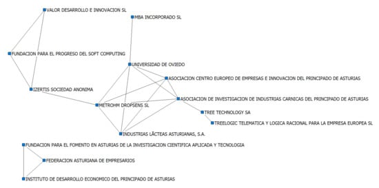 Regarding the instrumental and operational framework, this study relies on social network analysis (SNA). SNA has been proven as a powerful tool, previously used by different authors to assess sustainability aspects [17,18,19], as well as collaboration and projects’ relationships [20,21]. Taking into account that the H2020 program funds projects that are developed by consortia composed by at least three entities, this study analyzes the two underlying networks behind the innovation system: (1) the network of projects, in which projects that share partners are linked and (2) the network of entities, in which entities that cooperate in the same project are connected. These networks can be geographically restricted to the entities and projects nestled in a region and, thus, can enable the study of the relationships between the different types of entities within the region (industry, university, research centers, etc.), as well as the main research fields and technologies tackled by the projects developed in the region. The assessment of these networks enables the evaluation of the competitiveness increase of the regional industries, as well as the framework in which knowledge transfer and exchange is facilitated, or enabled [22,23].