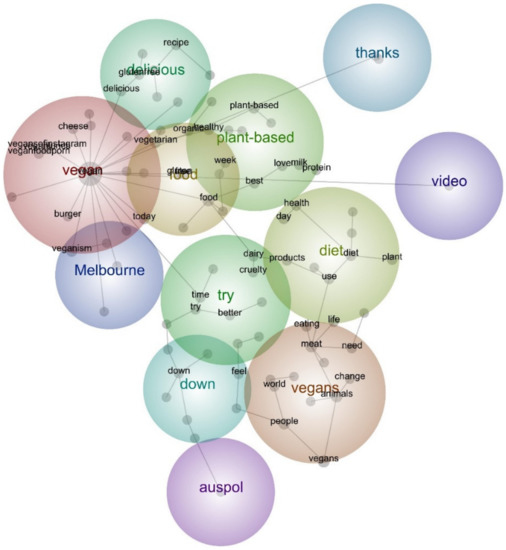 From the above table, we observe that ‘dairyfree’ is a prominent word, co-occurring with several food-related concepts, including ‘plant-based’, ‘vegetarian’, ‘healthy’, ‘recipe’, ‘glutenfree’, and ‘raw’. This indicates that dairy alternatives are most frequently discussed within vegan conversations and that they hold good potential for contemporary and future food products. Interestingly, there is considerable mention of skin in relation to concepts such as natural and organic, which may be useful for businesses that are currently (or interested) in the skin-care market, particularly given that there are a number of skin products, such as cleansers, cosmetics, and even sunscreen and tanning lotions, that could be a viable vegan business venture.