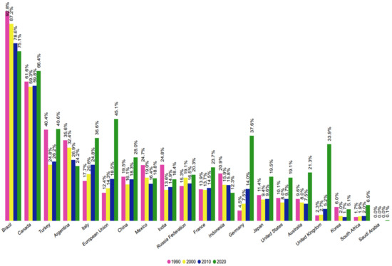 In 2020, only six countries had a renewable percentage in their electricity matrix lower than in 1990, namely Brazil, Argentina, Mexico, India, Indonesia, and Korea (see Figure 2). Brazil, despite showing the greatest reduction (17.7%), remained in first place in the composition of renewable electricity generation among all G20 countries. One of the smallest efforts to generate renewable electricity is in Saudi Arabia. The country did not have any source of renewable electricity in 1990, with a participation of only 0.1% of renewable sources in 2020. In addition, Mexico, India, and Korea, even with lower production of renewable electricity, compared to 1990, showed growth when compared to 2010. In this sense, Figure 2 shows the amount (in percentage) of renewable electricity generation in the G20 countries between 1990 and 2020.