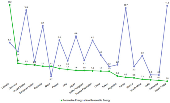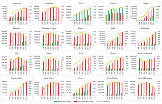Studies with the same perspective as this one have also been published in recent literature. [13] assessed the influences of renewable electricity generation in ASEAN-5 countries, i.e., in the Southeast Asian nations (Indonesia, Malaysia, the Philippines, Thailand, and Vietnam) during the period 1985–2016. In addition, [14] documented the historical growth of the wind energy industry and articulated projections for increased installed capacity from different agencies in China, the US, and the European Union. However, no studies were found covering the investigation of the trends for renewable electricity generation in the G20 countries. Therefore, this can be considered the novelty and significance of this study.