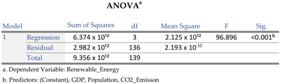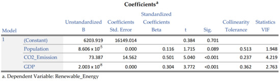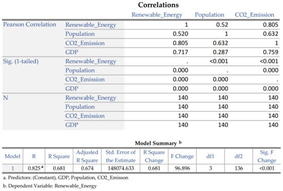 Finally, IBM SPSS Statistics 28.0 was used to identify the influence that the variables population, CO2 emission, and GDP have on the production of renewable electricity, and for this purpose, a multiple regression was performed. The main goal was to check which of the independent variables had greater influence on the dependent variable. The assumptions of linearity between variables, homogeneity of variances, and absence of multicollinearity were verified in order to perform the regression. After performing the regression, it was possible to identify how variables influence the production of renewable electricity and which one was the most relevant.